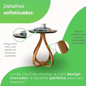 Essa mesa lateral une funcionalidade e sofisticação com seu tampo em MDF revestido com espelho, que adiciona brilho e modernidade ao design. Os pés em eucalipto, com acabamento natural, proporcionam um toque orgânico e acolhedor. Compacta e versátil, é perfeita para complementar diferentes ambientes, servindo como apoio para objetos decorativos ou itens do dia a dia. Uma peça que combina durabilidade e elegância de forma harmoniosa.