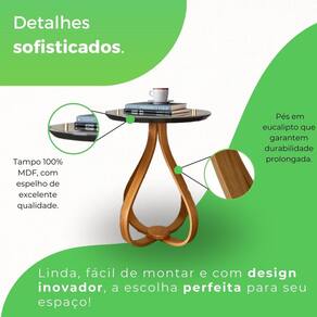 Essa mesa lateral combina funcionalidade e estilo com seu tampo em MDF revestido com espelho, que proporciona elegância e resistência. Os pés em eucalipto, com acabamento natural, trazem um toque orgânico e moderno ao design. Compacta e versátil, é perfeita para complementar diferentes ambientes com charme e praticidade. Ideal para apoiar objetos decorativos ou itens do dia a dia, une durabilidade e sofisticação.