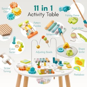 - Design inspirado em Montessori: esta mesa de atividades para crianças de 1 a 3 anos promove aprendizado prático e brincadeiras interativas. Atividades como classificação de formas, pesca e labirintos de contas melhoram as habilidades motoras finas e a coordenação olho-mão, promovendo a resolução de problemas e o desenvolvimento cognitivo
