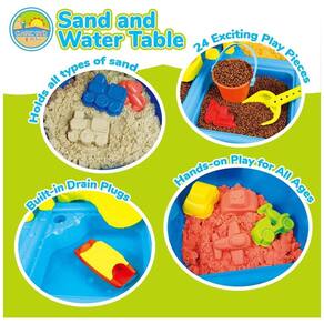 Sistema de Bandeja Grande e Resistente a Vazamentos - Com quatro bandejas individuais na mesa de areia, as crianças têm a liberdade de preenchê-las com brinquedos, água, areia, terra ou argila, proporcionando diversas opções de aprendizado. Cada bandeja possui também um plugue de drenagem rápida para facilitar a limpeza após a brincadeira.