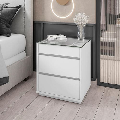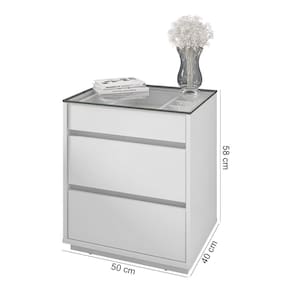 Características: Estrutura em MDF/MDP Pintura com acabamento Print Wood Atóxico Bordas com acabamento Soft PU 03 Gavetas com corrediças telescópicas sendo 01 com organizador interno para joias Tampo de vidro Pés em rodapé