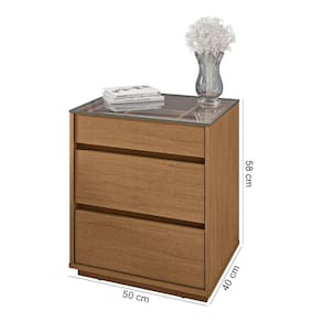 Características: Estrutura em MDF/MDP Pintura com acabamento Print Wood Atóxico Bordas com acabamento Soft PU 03 Gavetas com corrediças telescópicas sendo 01 com organizador interno para joias Tampo de vidro Pés em rodapé
