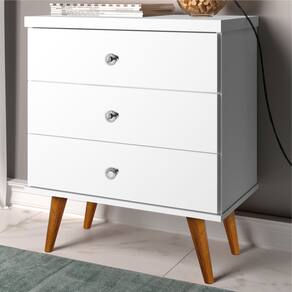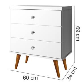 Estrutura: MDP Acabamento: Pintura U.V. Gavetas: Sim, 03 gavetas com corrediças metálicas, que suportam até 10 Kg distribuídosNicho: Não,Pés: Sim, 04 pés palito em madeiraDimensões do produto Montado