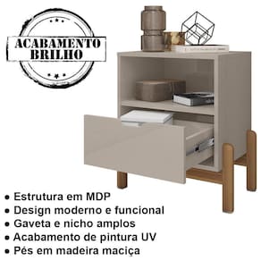 Mesa de Cabeceira 1 Gaveta 004015, é o móvel ideal para se ter ao lado da cama, pois ele armazena seus itens com muita comodidade e requinte. Possui amplo espaço e estilo, sem mencionar a qualidade, é um móvel fabricado com os melhores materiais do mercado. Estrutura elaborada em MDP de 25mm e 15mm, gaveta com corrediças telescópicas, o que garante mais praticidade e eficiência no dia-a-dia. Possui também nicho para a disposição de seus objetos mais utilizados. Suas gavetas não necessitam de puxadores, devido ao seu design. Sua pintura conta com acabamento Print Wood, patenteado e exclusivo Casa D, atóxico e anti mofo. Suporta até 20 kg distribuídos, seus pés são elaborados em madeira maciça, garantindo qualidade e segurança. Com sua versatilidade e estilo, ele irá acrescentar mais personalidade ao seu quarto. Este móvel chegará na sua casa separado em 01 volume.
