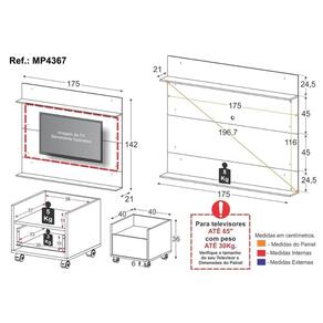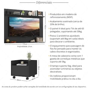 Especificações Técnicas: Painel - Altura: 142cm | Largura: 175cm | Profundidade: 21cm Mesa de Cabeceira - Altura: 36cm | Largura: 40cm | Profundidade: 40cm Material: MDP 15mm (proveniente de reflorestamento) Painel Indicado para TV: Sim, até 65" Peso Suportado no Painel: 30kg Passa Fios Incluso: Sim Quantidade de Gavetas na Mesa: 1 Tipo de Corrediça: Metálica roldana