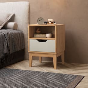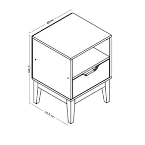 Características: 1 Gaveta 1 Nicho Corrediças telescópicas Estrutura em MDP 15mm Pés em madeira Maciça