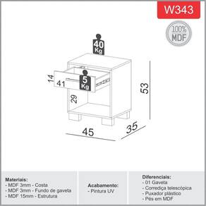 Características: Estrutura 100 MDF Pintura UV 1 Gaveta Corrediças telescópicas Gaveta suporta até 5 kg Puxador de plásticos Pés em MDF