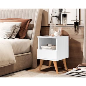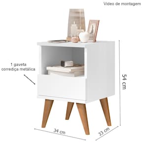 Mesa de cabeceira Pix estilo retrô, pés palito, embalado com caixa reforçada nas laterais para não ocorrer avaria no transporte.