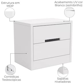 Mesa de Cabeceira S822, solução funcional para quartos com design moderno! Estrutura em MDP (15mm) com acabamento em pintura UV. Gavetas usinadas, corrediças telescópicas e sapatas niveladoras para maior facilidade no dia a dia, sendo prática e compacta. Este produto será entregue em 01 volume.
