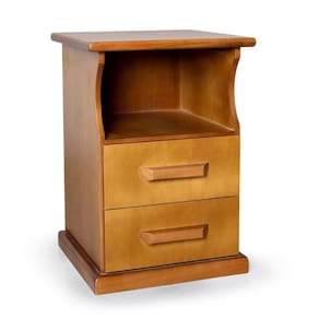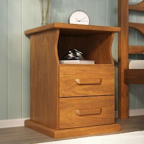 Mesa de Cabeceira 2 Gavetas Madeira Maciça Slin Móveis Nathalia, uma peça sofisticada que combina estilo e funcionalidade. Com corrediças telescópicas, suas gavetas deslizam suavemente, proporcionando fácil acesso aos seus itens. Os puxadores em madeira acrescentam um toque rústico e elegante. é projetado para suportar até 50 kg, garantindo segurança e durabilidade. Seu design sem pés, com rodapé, integra-se perfeitamente ao ambiente, enquanto a estrutura em madeira confere robustez e charme