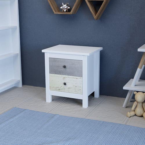 Mesa de cabeceira 2 gavetas Primavera é uma mesa de cabeceira com estilo demolição, as gavetas são coloridas, imitando madeira de demolição, dando um ar antigo e sofisticado ao seu ambiente. Composta 100% de madeira de pinus de reflorestamento legal.