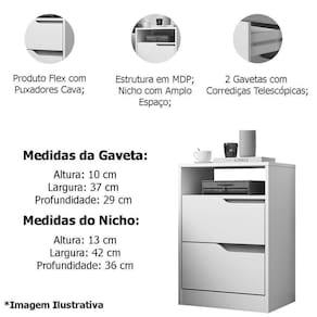 - Não nos responsabilizamos pela montagem dos produtos. Todos os produtos acompanham acessórios para que sejam montados. - Não nos responsabilizamos, no ato da , por subir escadas/elevadores ou transporte por guincho em apartamentos. Eventuais despesas são de responsabilidade do comprador; - Confira as dimensões deste produto e certifique-se de que passará normalmente por supostos elevadores, portas, escadas e/ou corredores de sua residência; - Não aceitamos de produtos com caixas violadas ou materiais danificados, confira a quantidade de volumes e se o que está sendo entregue corresponde com a mercadoria adquirida, não aceitamos após o prazo de arrependimento de 7 dias corridos. Características Gerais do Produto: - Altura: 65 cm - Gavetas: 2 Gavetas com Corrediças Telescópicas - Ideal para: Quarto - Informações Adicionais: Nicho aberto para acomodar objetos; Puxadores cava; Não acompanha objetos decorativos; - Largura: 45 cm - Material: MDP - Pintura: Fosco/Brilho - Profundidade: 36 cm - Acabamento: Pintura UV - Informações Adicionais: - Não nos responsabilizamos pela montagem dos produtos. Todos os produtos acompanham acessórios para que sejam montados. - Não nos responsabilizamos, no ato da , por subir escadas/elevadores ou transporte por guincho em apartamentos. Eventuais despesas são de responsabilidade do comprador - Confira as dimensões deste produto e certifique-se de que passará normalmente por supostos elevadores, portas, escadas e/ou corredores de sua residência - Não aceitamos de produtos com caixas violadas ou materiais danificados, confira a quantidade de volumes e se o que está sendo entregue corresponde com a mercadoria adquirida, não aceitamos após o prazo de arrependimento de 7 dias corridos.