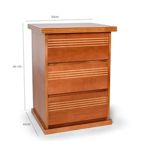 Mesa de Cabeceira 3 Gavetas Madeira Maciça Dubai Móveis Nathalia, uma peça única que combina funcionalidade e estilo. Com corrediças telescópicas, oferece um deslizamento suave e funcional. Seus puxadores angulados a 45° garantem um toque moderno e diferenciado. Este produto é capaz de suportar até 50 kg, proporcionando segurança e durabilidade. Seu design elegante não conta com pés, apresentando um rodapé que se integra perfeitamente ao ambiente