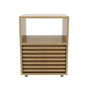 A Mesa de Cabeceira CM8042 Tecnomobili é a escolha perfeita para quem busca funcionalidade e estilo no quarto. Com acabamento em amêndoa e um charmoso detalhe ripado, essa mesa combina elegância e praticidade, oferecendo um espaço ideal para guardar itens essenciais e adicionar um toque de sofisticação ao ambiente. A gaveta proporciona armazenamento discreto e organizado para itens pessoais, como livros, acessórios ou itens de uso diário, mantendo a superfície da mesa limpa e arrumada. Além da gaveta, conta com um nicho aberto, ideal para guardar livros, revistas ou decorar com objetos de sua preferência, como luminárias ou plantas. Escolha perfeita para quem deseja uma peça prática, elegante e funcional para seu quarto. Seu design moderno e sofisticado é a escolha perfeita para transformar o ambiente.