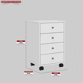 Material: MDP | Cor: Branco | Cômoda Altura x Largura x Profundidade: 0,72 x 0,45 x 0,36 | Material da Cômoda: MDP | Quantidade de Portas Cômoda: 0 | Quantidade de Gavetas Cômoda: 4 | Cômodo Indicado: Quarto | Possui Prateleira: Não | Possui Gaveta: Sim | Tipo da Corrediça: Metálica | Possui Rodizios: Sim | Nome do Simples no Fornecedor: Presence | do Fabricante: 3 Meses | Instruções/Cuidados: Evite com líquidos. Nada de lavar os móveis. Móveis não gostam de umidade. Não deixe o móvel exposto ao sol. Os acessórios também precisam de limpeza. | Material para Filtro: MDP | Quantidade de Volumes: 2 | Peso Bruto: 16 | Conteúdo Embalagem: Mesa de cabeceira | Origem: | Estado de Origem: Estado de Origem | Paraná: Peso Bruto (volume 01) | 16: Comprimento x Largura x Altura (volume 01) | 0,66 x 0,37 x 0,14: Cor: Branco
