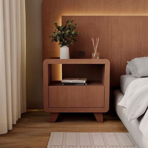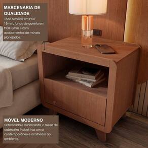 A Mesa de Cabeceira Mabel é a escolha ideal para quem busca elegância, funcionalidade e qualidade com o mesmo padrão dos móveis planejados. Produzida em 100% MDF com revestimento BP e acabamento em fita de borda PVC 0,045cm, garante durabilidade, resistência e acabamento sofisticado. Com 1 gaveta espaçosa e 1 nicho aberto, é perfeita para organizar livros, objetos pessoais e apoiar luminárias ou itens decorativos. Seu design moderno com pés robustos traz leveza e versatilidade, combinando facilmente com cabeceiras, camas e guarda-roupas em diferentes estilos. Com 55 cm de altura e 38 cm de profundidade, oferece praticidade no dia a dia sem abrir mão da beleza. Acabamento da Gaveta: Melamínico Acabamento dos Pés: Melamínico Altura dos Pés: 11,5 cm Ambiente Principal: Quarto Complexidade da Montagem: Média: pode ser montado por mais de uma pessoa e/ou necessite de maior conhecimento para montagem Cor: Castanho Cor do Produto: Castanho Cor Flex: Não Cor Interna: Branco Escala de Brilho: Fosco Escala de Brilho da Gaveta: Fosco Gaveta com Chave: Não Informações Complementares: Limpar somente com um pano levemente umedecido. Indicado para ambientes internos. Itens Inclusos: 1 Mesa de Cabeceira, Kit Ferragens e Manual de Montagem Linha ou Coleção: Mabel Manual de Montagem e Instalação: https://product-hub-prd.madeiramadeira.com.br/474255345/documents/21e136bf-37c5-49cf-b4bc-1c453b864ecb3105423657817538765459999.pdf Marca: FD Material da Gaveta: MDF Material dos Pés: MDF Material Principal: MDF Montagem Flex: Não Necessita Montagem: Sim Origem do Produto: Nacional Pés Reguláveis: Não Peso: 15 kg Peso Máximo por Gaveta: 5 kg Pet Friendly: Não Possui Espelho: Não Possui Possui Nichos: 01 Possui Pés: 04 Possui Portas: Não Possui Prateleiras: Não Possui Vidro: Não Quantidade de Nichos: 01 Recomendações de Uso, Manutenção e Limpeza: Limpar somente com um pano levemente umedecido. Indicado para ambientes internos Sapatas Niveladoras: Não Sistema de Montagem: Parafusos, cavilhas e minifix Suporta Até (kg): 5 kg Tipo de Corrediça da Gaveta: Metálica Telescópica Tipo de Puxador da Gaveta: Embutido