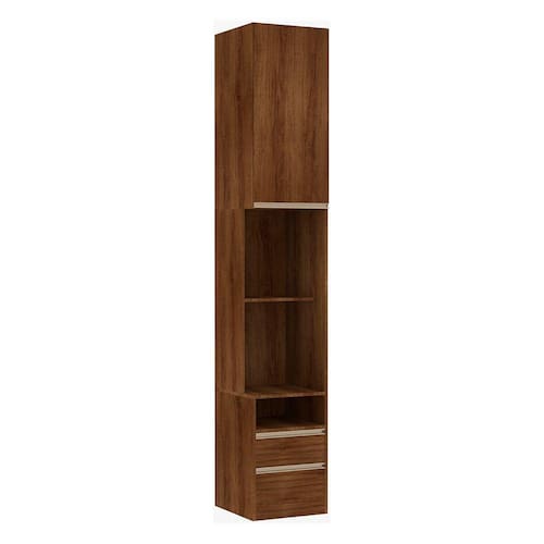Características: Matéria Prima: MDP 15mm Corpo/Caixaria: MDP Nogueira Dourado PF. Frontais: MDP BP. Estrutura e prateleira: FF Prateleiras: 4 Portas: 1 Gavetas: 2 Corrediças: Sim, telescópicas Dobradiças: Não Puxadores: Perfil alumínio Cabideiro: Não Montagem com Minifix, Parafusos e cavilhas.