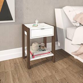 Mesa de Cabeçeira para Quarto Decorativa AZ1016 MDP Branco/Nogal - Gran Belo Possui tomada na sua base, possui uma gaveta, estrutura em MDP, acabamento de excelente qualidade. Com designer contemporâneo, e linhas simétricas, a união de suas sobre cores m ao ambiente sensações de harmonia e elegância entre a decoração. Prática e cheio de estilo se destaca em qualquer tipo de ambiente.