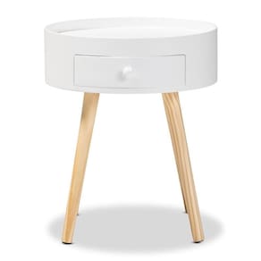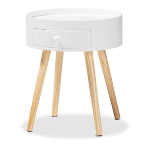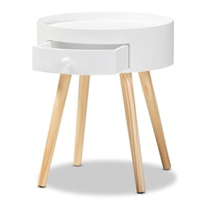 Dê ao seu quarto um senso de estilo pessoal ao adicionar esta mesa de cabeceira redonda moderna de madeira de uma gaveta de meados do século da coleção Jessen da Baxton Studio. É feito com um acabamento branco deslumbrante sobre uma construção em MDF e madeira de pinho e três pernas angulares. O único compartimento de armazenamento é espaçoso o suficiente para lençóis extras e outros acessórios.
