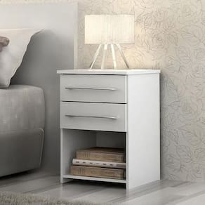 MESA DE CABECEIRA BRUNA | Com 2 gavetas em corrediças metálicas e espaço para livros a mesa de cabeceira Bruna vai deixar o seu quarto mais organizado. Possui um design moderno e puxadores cromados. Além disso, o produto possui uma fácil montagem. A mesa possui montagem flex com as gavetas podendo ser montadas tanto para cima como para baixo.