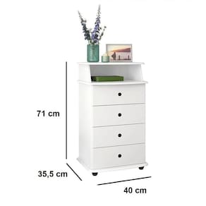Observações: - 04 Gavetas; - Produto de alta qualidade e durabilidade; - Pés em Plástico anti-umidade - Nicho; - Pintura em acabamento fosco; - Produzido em MDF e MDP;