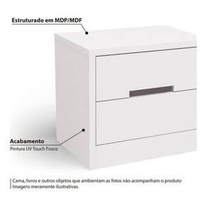 Construída em MDF e MDP, a mesa de cabeceira é robusta e durável, com capacidade de peso de 12 Kg. Possui duas gavetas de madeira, cada uma com capacidade de peso de 6 Kg, proporcionando amplo espaço de armazenamento. As gavetas têm fechamento comum e puxadores embutidos de madeira, garantindo facilidade de uso e um acabamento elegante. A ausência de rodas e prateleiras garante a estabilidade do móvel, enquanto a falta de portas facilita o acesso aos itens armazenados.