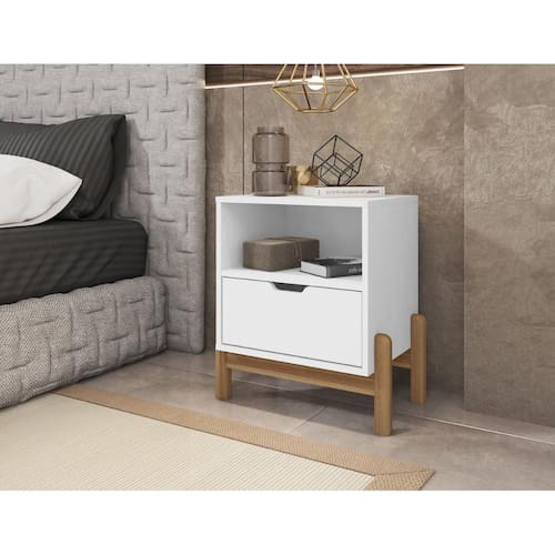 Mesa de Cabeceira Antares é ideal para deixar seu ambiente aconchegante e estiloso, com um design moderno e muito funcional, contém uma gaveta e um nicho com muito espaço para guardar seus pertences. Mesa de cabeceira com pés de madeira maciça, tornando-o ainda mais resistente. Acabamento de pintura UV. Frente de gaveta usinada.