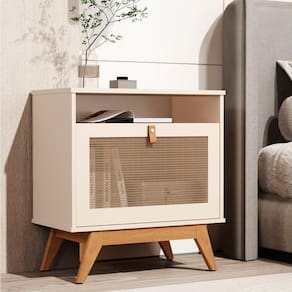 Com porta em ratam, pés em madeira maciça e acabamento de alta qualidade em MDF, ela é perfeita para organizar com estilo.