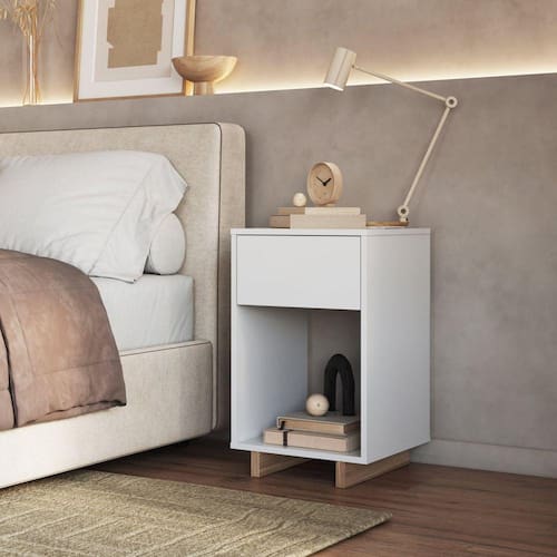 A Mesa de Cabeceira e Mesa Lateral da Nova Mobile é um móvel que possui o espaço ideal para sua casa. Com 1 ampla gaveta, mais 1 nicho é um móvel ideal para organizar seus pertences, perfeito para se encaixar ao lado da cama, ter um apoio para luminária, livros e ainda apoiar o celular enquanto carrega e etc. Móveis com design contemporâneo e cores diferenciadas que se harmonizam facilmente com todos os estilos de ambientes. Produto com alta resistência desenvolvidos MDP. Acabamento da Gaveta: Finish Foil Acabamento dos Pés: Finish Foil Altura dos Pés: 35,5 cm Ambiente Principal: Quarto Complexidade da Montagem: Baixa: pode ser montado por uma pessoa sozinha Cor: Branco / Montana Cor do Produto: Branco / Montana Cor Flex: Não Cor Interna: Branco Escala de Brilho: Fosco Escala de Brilho da Gaveta: Fosco Gaveta com Chave: Não Itens Inclusos: 1 mesa de cabeceira e manual de montagem Linha ou Coleção: Mesa de Cabeceira Manual de Montagem e Instalação: https://cdn2.madeiramadeira.com.br/atributo/nova-mobile/1774482-7898463866324-5-b88-manual-montagem-portugues-espanhol.pdf Material da Gaveta: MDP Material dos Pés: MDP Material Principal: MDP Montagem Flex: Não Necessita Montagem: Sim Origem do Produto: Nacional Pés Reguláveis: Não Peso: 11,5 kg Peso Máximo por Gaveta: 5 kg Pet Friendly: Não Possui Espelho: Não Possui Possui Nichos: 01 Possui Pés: 02 Possui Portas: Não Possui Prateleiras: Não Possui Vidro: Não Quantidade de Nichos: 01 Recomendações de Uso, Manutenção e Limpeza: Para a limpeza do móvel utilizar uma flanela seca. Sapatas Niveladoras: Não Sistema de Montagem: Parafusos, cavilhas e minifix Suporta Até (kg): 15 kg Tipo de Corrediça da Gaveta: Metálica Telescópica Tipo de Puxador da Gaveta: Não Possui - Abertura por Fecho Toque