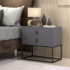 A Mesa de cabeceira possui os pés em ferro. As gavetas possuem corrediças telescópicas, o que dá maior qualidade, delicadeza e durabilidade ao produto e os puxadores em couro, somos pioneiros nessa tendencia que está bombando na europa.