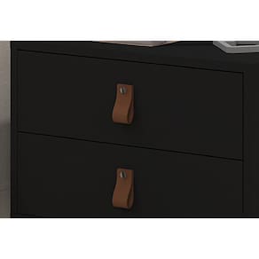 A Mesa de cabeceira possui os pés em ferro. As gavetas possuem corrediças telescópicas, o que dá maior qualidade, delicadeza e durabilidade ao produto e os puxadores em couro, somos pioneiros nessa tendencia que está bombando na europa.