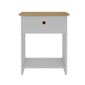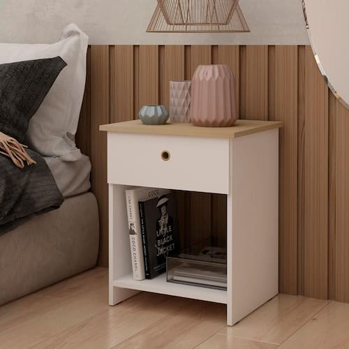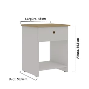 ESPECIFICAÇÕES - Possui 1 gaveta e 1 nicho - Estrutura em MDP/BP 15 mm - Tampo padrão amadeirado Savana - Puxador plástico - Corrediça plástica - Acabamento com pintura UV