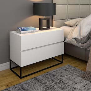2 gavetas espaçosas (suportam até 9 kg cada) com corrediças telescópicas e puxadores discretos em cava.