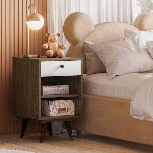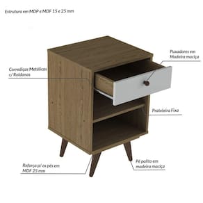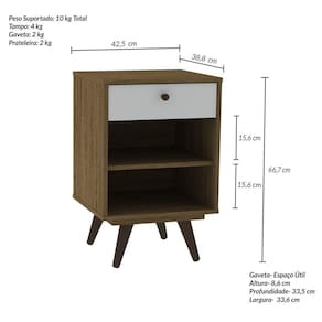A Mesa para Cabeceira Retrô Luna branco possui um design do retrô ao contemporâneo deixando o ambiente sofisticado. Possui uma gaveta deslizante, dois compartimentos abertos para objetos ou decoração. Acabamento da Gaveta: Pintura UV Acabamento da Prateleira: Pintura UV Acabamento dos Pés: Verniz Altura dos Pés: 17 Ambiente Principal: Quarto Infantil Complexidade da Montagem: Média: pode ser montado por mais de uma pessoa e/ou necessite de maior conhecimento para montagem Cor: Rustik/Branco Cor do Produto: Rustik/Branco Cor Flex: Não Cor Interna: Rustik/Branco Escala de Brilho: Acetinado Escala de Brilho da Gaveta: Semi-Brilho Escala de Brilho da Prateleira: Semi-Brilho Gaveta com Chave: Não Itens Inclusos: 01 Mesa de Cabeceira e Manual de Montagem. Linha ou Coleção: Retrô Luna Manual de Montagem e Instalação: https://product-hub-prd.madeiramadeira.com.br/874732/documents/af80534b-205e-4376-9166-2882169fc472nualexpcriadorpluspEchaste.pdf Material da Gaveta: MDP Material da Prateleira: MDP Material do Puxador da Gaveta: Madeira Maciça Material dos Pés: Madeira Maciça Material Principal: MDP Montagem Flex: Não Necessita Montagem: Sim Origem do Produto: Nacional Pés Reguláveis: Não Peso: 12 Peso Máximo por Gaveta: 2 Peso Máximo por Prateleira: 2 Pet Friendly: Não Possui Espelho: Não Possui Nichos: Não Possui Pés: 04 Possui Portas: Não Possui Prateleiras: 01 Possui Vidro: Não Recomendações de Uso, Manutenção e Limpeza: Limpeza com pano umedecido. Não aplicar lustra móveis. Sapatas Niveladoras: Não Sistema de Montagem: Parafusos, Cavilhas e Minifix. Suporta Até (kg): 10 Tipo de Corrediça da Gaveta: Metálica Simples Tipo de Madeira Maciça dos Pés: Pinus Tipo de Puxador da Gaveta: Externo Ean: 7909903468166