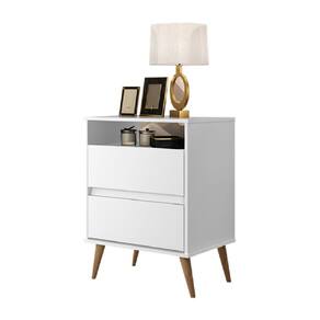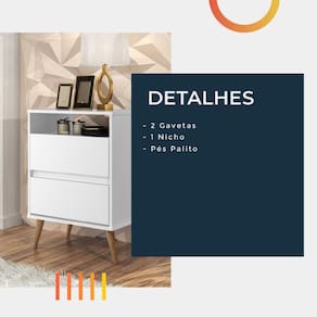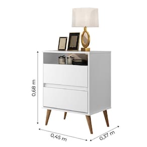 A mesa de Cabeceira Lótus, 2 gavetas e 1 nicho, com pés palito em madeira. Modelo retro, vaidestacarseu ambiente com seu design elegante. Possui pintura UV, com texturaque agrega ao produto resistência e durabilidade./ MODELO: Mesa de Cabeceira/ MARCA: J&A Móveis/ COR: Branco/ Medidas:[ A ] =71 cm[ L ] = 37 cm[ P ] = 45 cm/ MATERIAL: MDP 12mm/ ACABAMENTO: Pintura UV/ CORREDIÇA: Metálica/ QUANTIDADE DE NICHO: 1/ QUANTIDADE DE GAVETAS: 2/ QUANTIDADE DE PÉS: 4/ PESO DO PRODUTO: 12Kg/ GAVETAS SUPORTAM: Até 10Kg/ NICHOS SUPORTAM: Até 15Kg/ MATERIAL DOS PÉS: Madeira Pinnus/ Montagem não inclusa. Entregamos até a porta de entrada da casa do cliente ou até a portaria do condomínio.