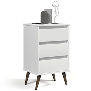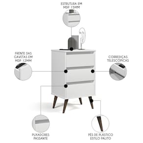 Que tal adicionar um toque de charme vintage ao seu quarto com a Mesa de Cabeceira Pés Retrô 3 Gavetas 43cm Wood Branco, da EJ Móveis? Esse móvel elegante e funcional é perfeito para complementar qualquer estilo de decoração.
