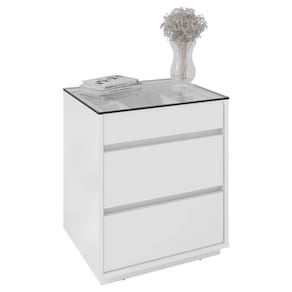 Material da mesa de cabeceira: MDP de 25mm e 15mm com tampo de vidro 8mm;