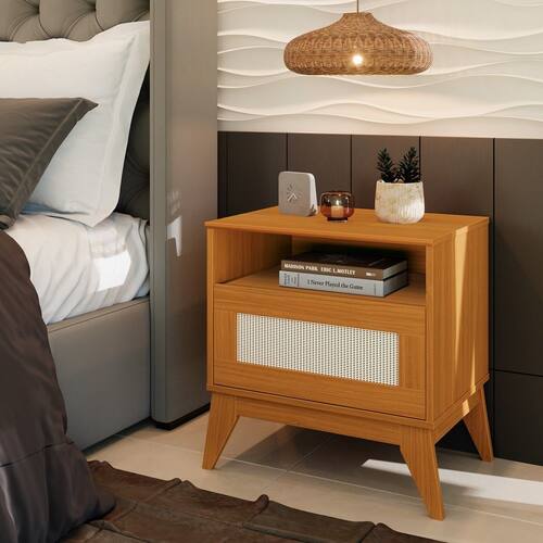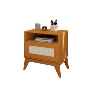Com uma estrutura em MDP e tampo em MDF, esta mesa de cabeceira combina durabilidade e estilo em um único móvel. Possui uma gaveta com acabamento em tela Rathan sintético e moldura, equipada com corrediças telescópicas para facilitar o acesso aos seus pertences. Seus 4 pés em MDF garantem estabilidade e sofisticação ao conjunto.