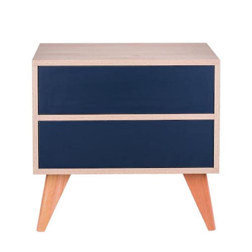 Mesa de Cabeceira Retrô Modelo Bréscia na cor Carvalho Treviso (Madeira Clara) e portas Azul Marinho traz organização com estilo para o seu quarto. Possui lindos pés torneados em diagonal.