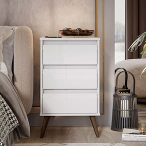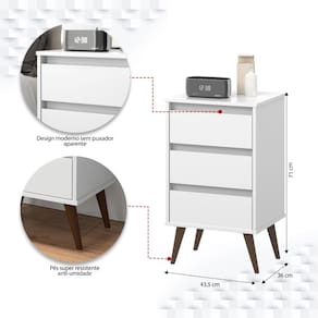 Características: Estrutura MDP Acabamento UV 03 Gavetas com Corrediças Telescópicas Sem Puxadores Externos Pés Retrô em Plástico Anti-umidade Suporta 8kg distribuídos