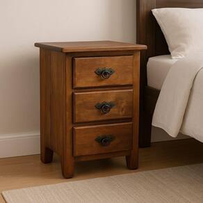 Adicione charme e funcionalidade ao seu ambiente com esta mesa de cabeceira rústica em madeira maciça. Com acabamento natural e detalhes em metal nos puxadores, a peça oferece três gavetas espaçosas para organização de objetos pessoais. Ideal para quartos ou escritórios com estilo rústico ou retrô.
