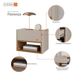 Mesa de Cabeceira Suspensa Florença 1 Gaveta - Casa D Com design compacto, moderno e funcional, a Mesa de Cabeceira Suspensa Florença é perfeita para otimizar o espaço do seu quarto. Produzida em MDF e MDP com pintura UV, traz elegância e praticidade ao ambiente. Possui 1 gaveta com corrediças telescópicas que garantem abertura suave e durabilidade, além de nicho interno ideal para organizar objetos do dia a dia. Por ser suspensa, facilita a limpeza e proporciona um visual mais leve e contemporâneo ao ambiente.