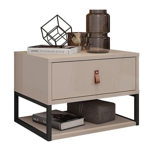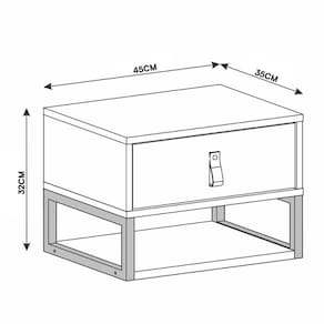 ESPECIFICAÇÕES: Estrutura em MDP Acabamento Print Wood 1 Gaveta Corrediças telescópicas Puxador de alça em couro ecológico 1 Nicho com laterais de aço Suspensa