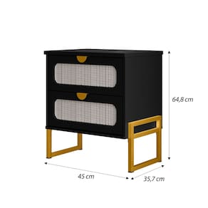 Tipo: Mesa de Cabeceira Modelo: Titanium Cor: Preto Cor da Base: Dourado Estrutura: MDP com acabamento em pintura UV Pés: Metal com pintura eletrostática Possui 2 gavetas: Corrediças metálicas Frentes decorativas em padrão rattan Puxadores embutidos Design: Moderno, funcional e elegante Garantia: 3 meses contra defeitos de fabricação