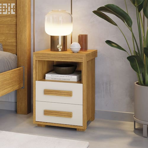 Mesa de Cabeceira Tóquio 100% MDF - Funcional e discreto, o Mesa de Cabeceira Tóquio é a escolha ideal para complementar o quarto com praticidade e sofisticação. Produzido 100% em MDF, conta com 2 gavetas com corrediças telescópicas, puxadores em MDF, tampo reforçado e pés em madeira. Estrutura com encabeçamento de 20 mm nas laterais e base.