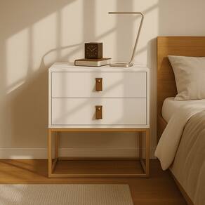 Mesa de Cabeceira UNIC 45 Transforme seu ambiente com esta mesa de cabeceira que une charme retrô, robustez e funcionalidade! Ideal para quartos, salas ou ambientes contemporâneos, seu design industrial destaca-se pela combinação de materiais e acabamentos de alta qualidade. Destaques do Produto: - Design Retrô Industrial: Combina linhas minimalistas com o toque rústico dos puxadores em couro natural e a base metálica em ferro.- Estrutura Resistente: Corpo em MDF/MDP de alta qualidade com pintura, garantindo elegância e durabilidade.- Puxadores em Couro: Dois puxadores em couro natural que proporcionam um acabamento sofisticado e luxuoso.- Base em Ferro: Estrutura robusta em ferro com pintura eletrostática, estilo geométrico aberto, oferecendo estabilidade e um visual leve.- 2 Gavetas Espaçosas: Ideal para organizar objetos pessoais, livros, acessórios ou itens do dia a dia, mantendo seu ambiente sempre em ordem. Especificações Técnicas: