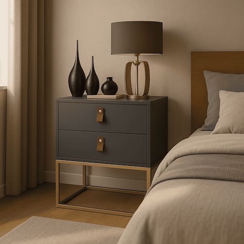 - Design Retrô Industrial: Combina linhas minimalistas com o toque rústico dos puxadores em couro natural e a base metálica em ferro.- Estrutura Resistente: Corpo em MDF/MDP de alta qualidade com pintura, garantindo elegância e durabilidade.- Puxadores em Couro: Dois puxadores em couro natural que proporcionam um acabamento sofisticado e luxuoso.- Base em Ferro: Estrutura robusta em ferro com pintura eletrostática, estilo geométrico aberto, oferecendo estabilidade e um visual leve.- 2 Gavetas Espaçosas: Ideal para organizar objetos pessoais, livros, acessórios ou itens do dia a dia, mantendo seu ambiente sempre em ordem.