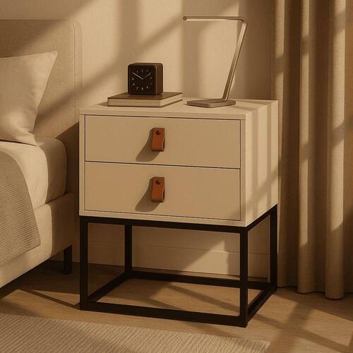 Destaques do Produto:- Design Retrô Industrial: Combina linhas minimalistas com o toque rústico dos puxadores em couro natural e a base metálica em ferro.- Estrutura Resistente: Corpo em MDF/MDP de alta qualidade com pintura, garantindo elegância e durabilidade.- Puxadores em Couro: Dois puxadores em couro natural que proporcionam um acabamento sofisticado e luxuoso.- Base em Ferro: Estrutura robusta em ferro com pintura eletrostática, estilo geométrico aberto, oferecendo estabilidade e um visual leve.- 2 Gavetas Espaçosas: Ideal para organizar objetos pessoais, livros, acessórios ou itens do dia a dia, mantendo seu ambiente sempre em ordem.