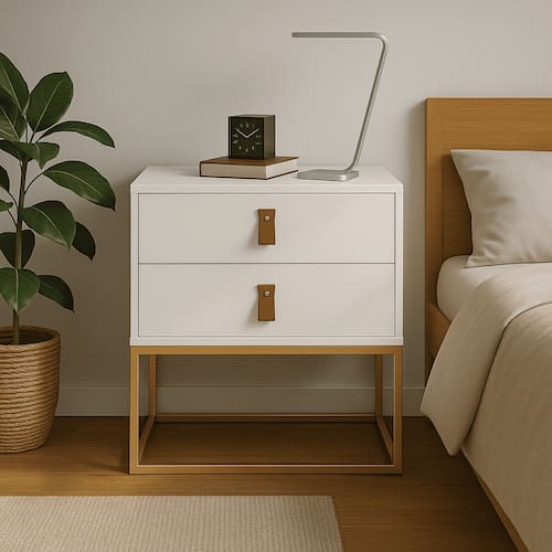 - Design Retrô Industrial: Combina linhas minimalistas com o toque rústico dos puxadores em couro natural e a base metálica em ferro.- Estrutura Resistente: Corpo em MDF/MDP de alta qualidade com pintura, garantindo elegância e durabilidade.- Puxadores em Couro: Dois puxadores em couro natural que proporcionam um acabamento sofisticado e luxuoso.- Base em Ferro: Estrutura robusta em ferro com pintura eletrostática, estilo geométrico aberto, oferecendo estabilidade e um visual leve.- 2 Gavetas Espaçosas: Ideal para organizar objetos pessoais, livros, acessórios ou itens do dia a dia, mantendo seu ambiente sempre em ordem.