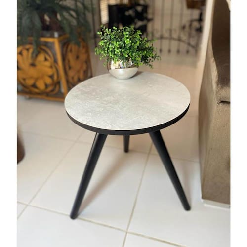 Mesa de canto redonda, tampo em mdf 18mm laminado visual de concreto decor. O corte é feito a laser com alta precisão e acabamento impecável. Os 3 pés palitos são produzidos em madeira. Esta é uma linda peça para deixar seu ambiente mais elegante, organizado e aconchegante. Somente ambientes internos.